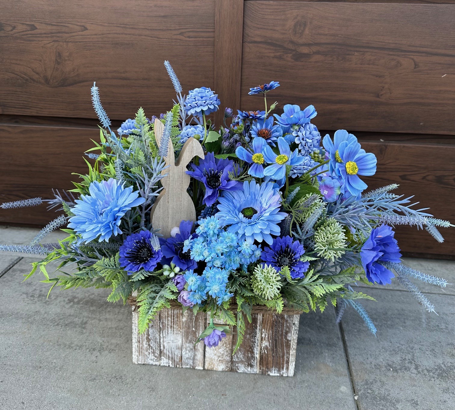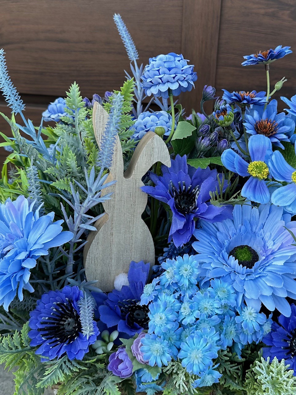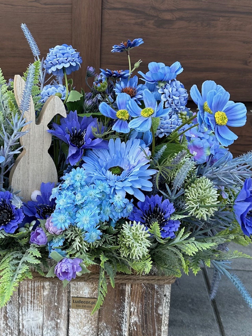 Dekoracja wielkanocna którą tworzą niebieskie kwiaty połączone z zielonymi gałązkami. Niewątpliwą ozdobą dekoracji jest drewniany zając – subtelny symbol Świąt Wielkanocnych, który dodaje dekoracji uroku i podkreśla jej świąteczny charakter.