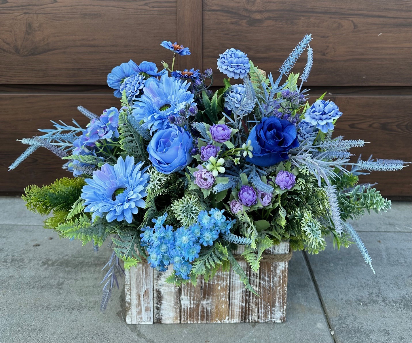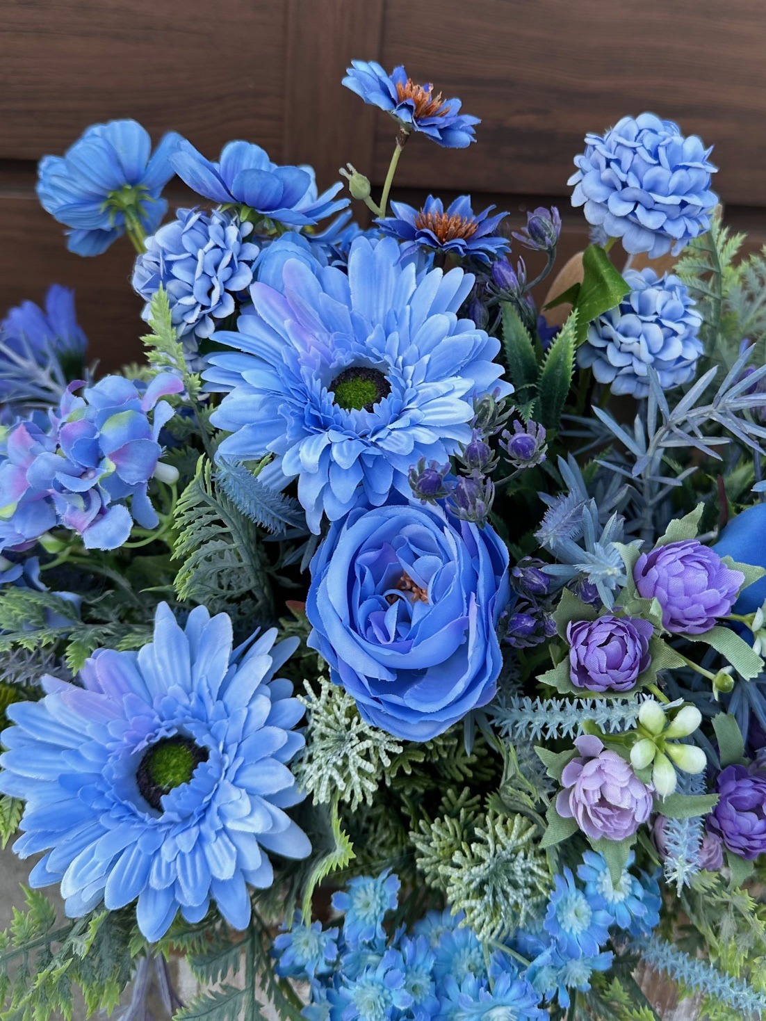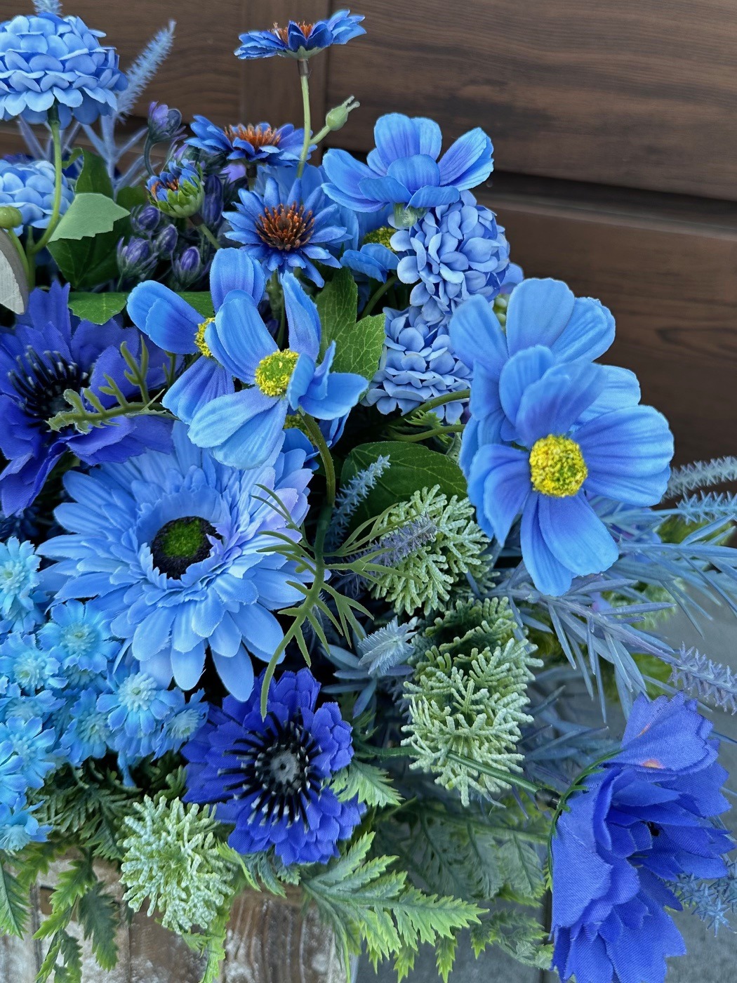 Dekoracja wielkanocna którą tworzą niebieskie kwiaty połączone z zielonymi gałązkami. Niewątpliwą ozdobą dekoracji jest drewniany zając – subtelny symbol Świąt Wielkanocnych, który dodaje dekoracji uroku i podkreśla jej świąteczny charakter.