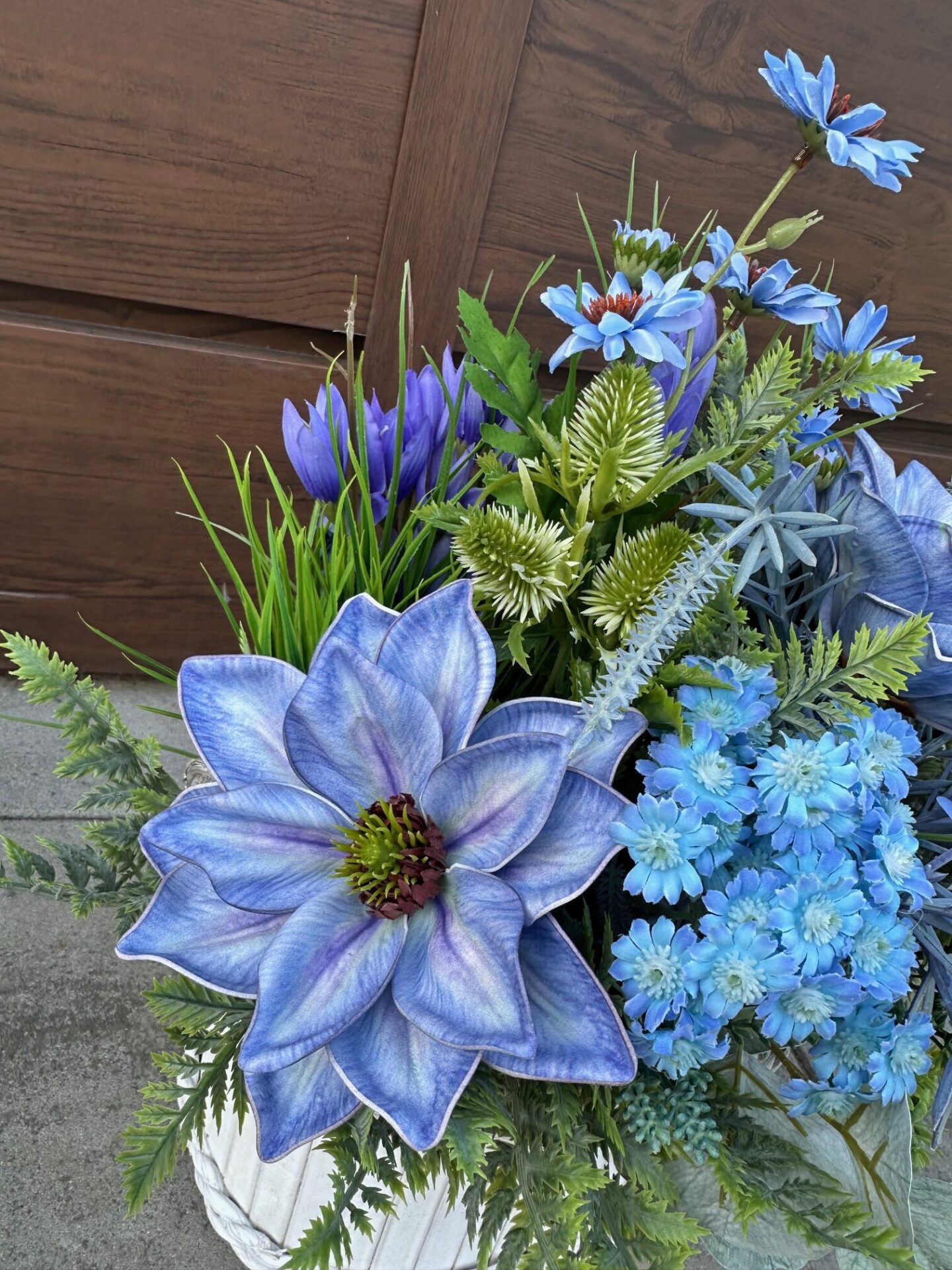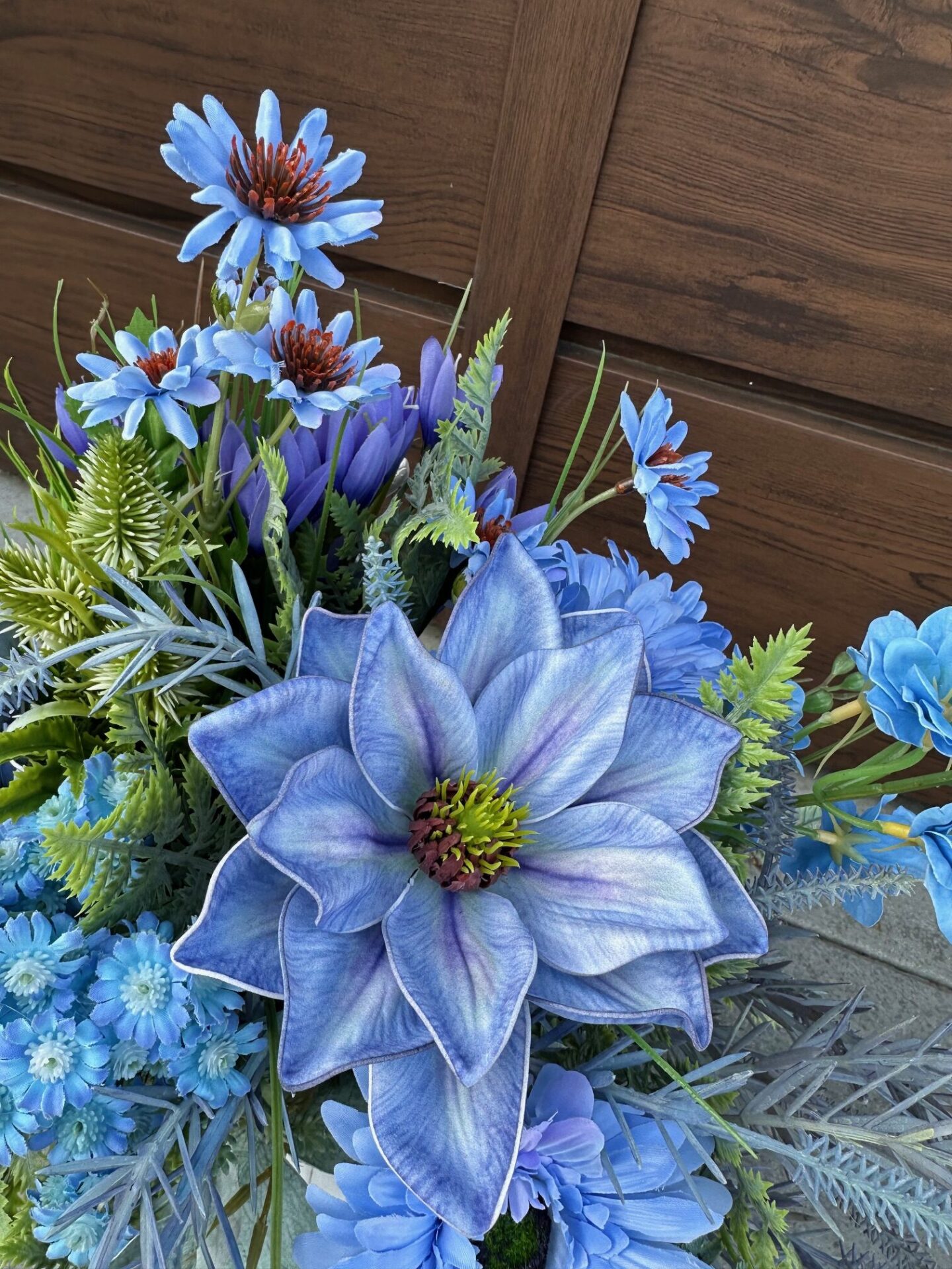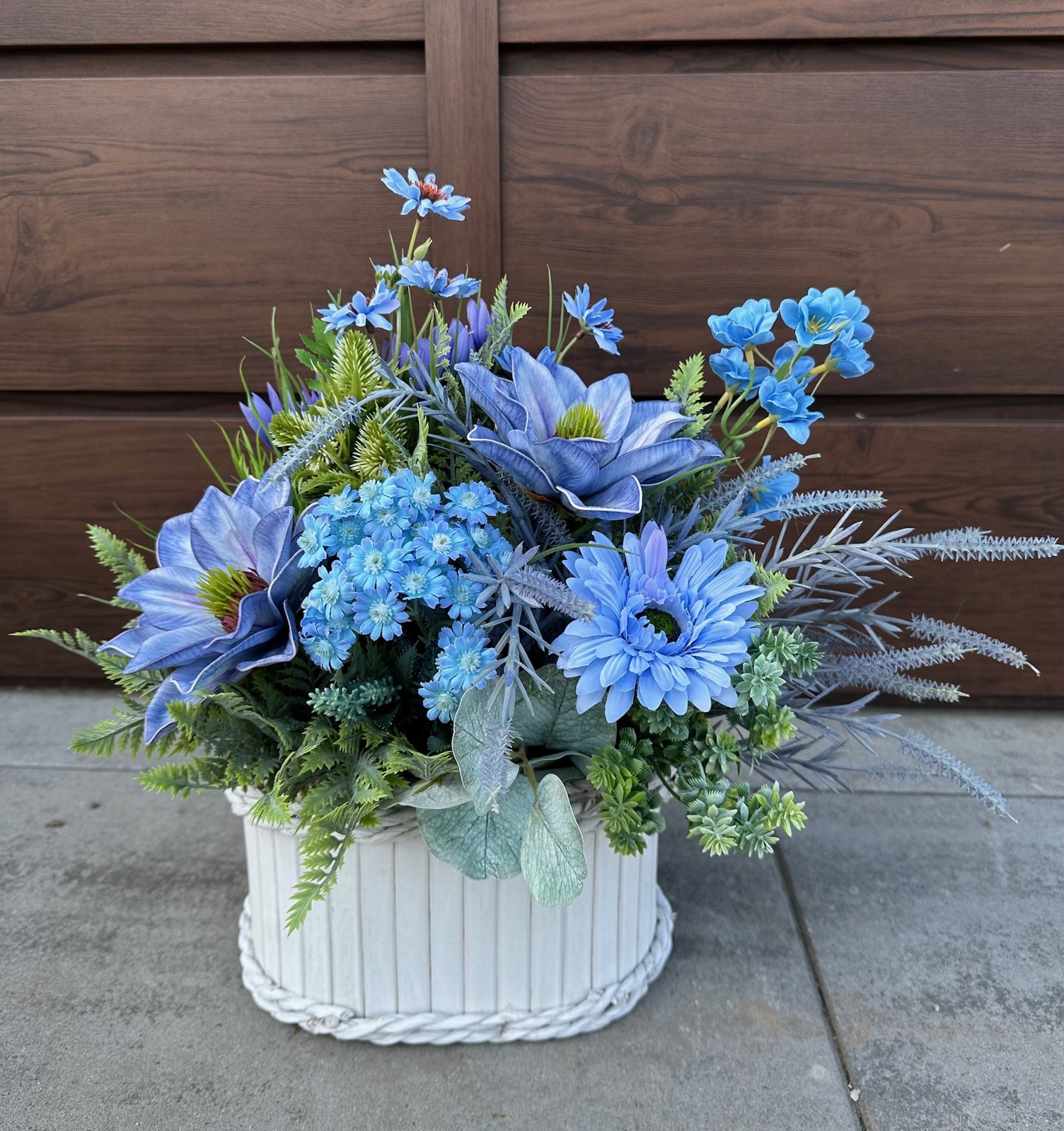 Dekoracja wielkanocna którą tworzą niebieskie kwiaty połączone z zielonymi gałązkami. Niewątpliwą ozdobą dekoracji jest ceramiczny zając – subtelny symbol Świąt Wielkanocnych, który dodaje dekoracji uroku i podkreśla jej świąteczny charakter.