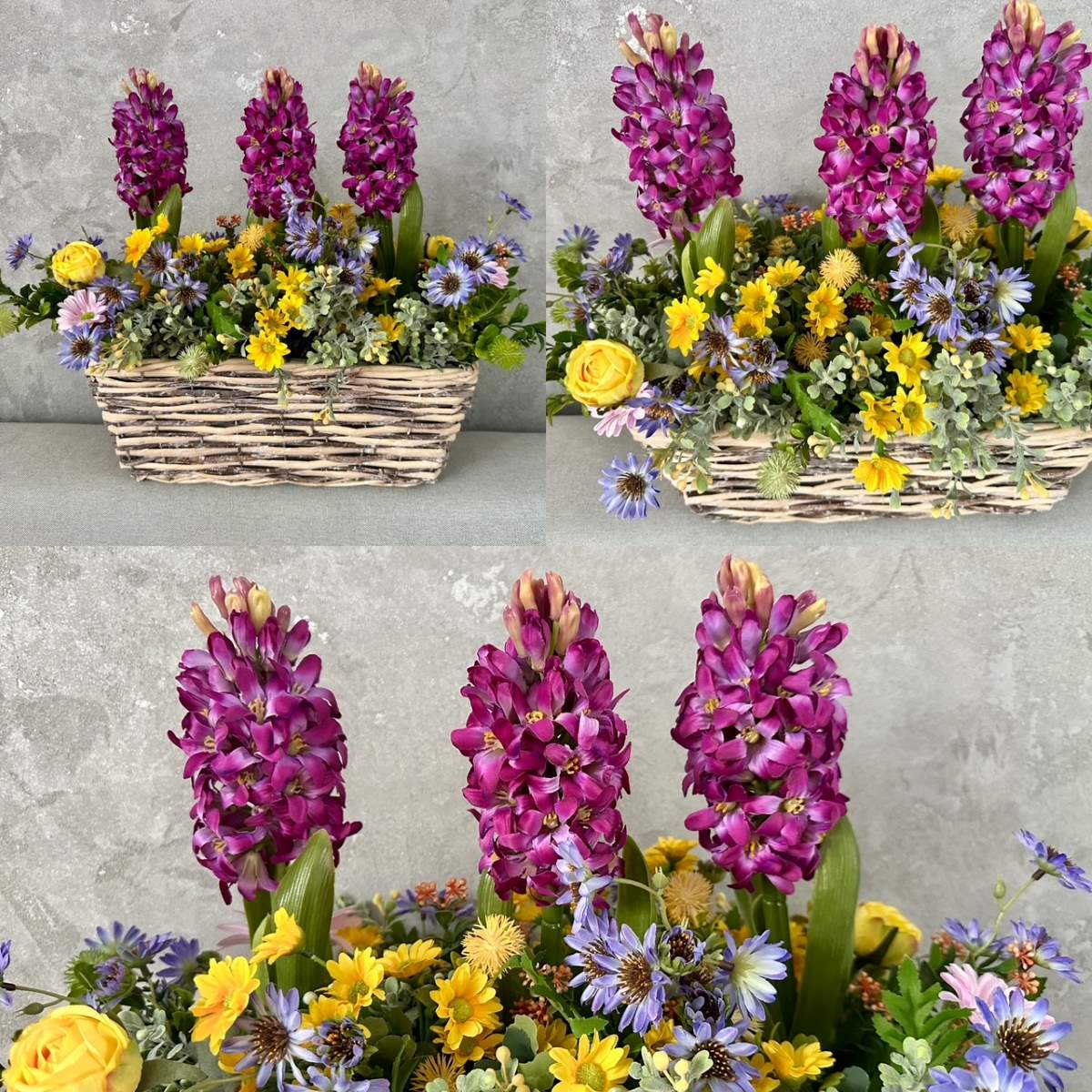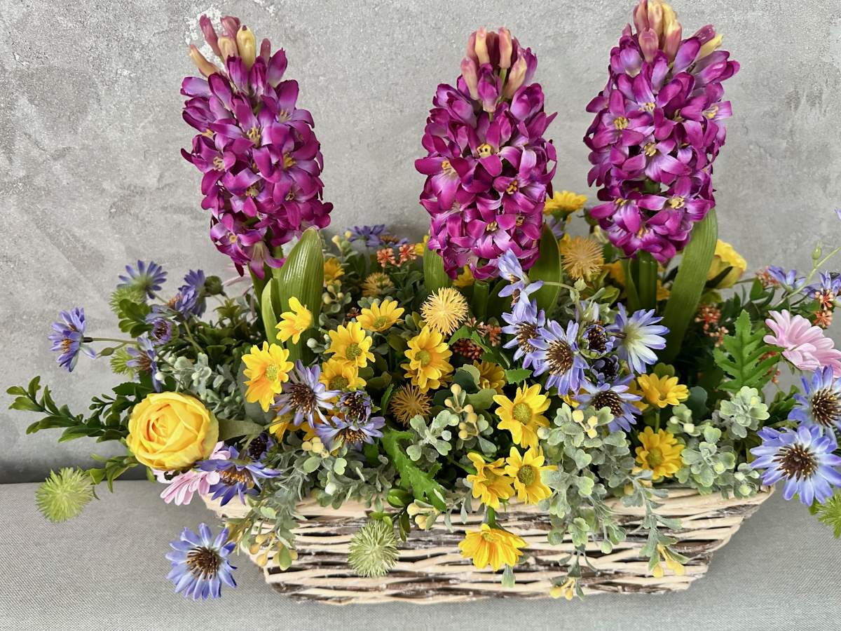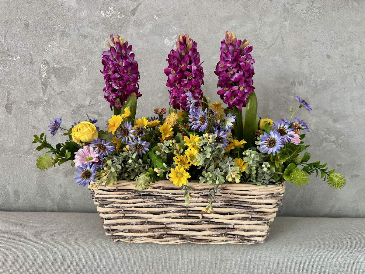 Oryginalna wiosenna dekoracja wykonana w drewnianej osłonce. Kompozycja udekorowana różnorodnymi kwiatami. Motywem dominującym dekoracji są hiacynty.