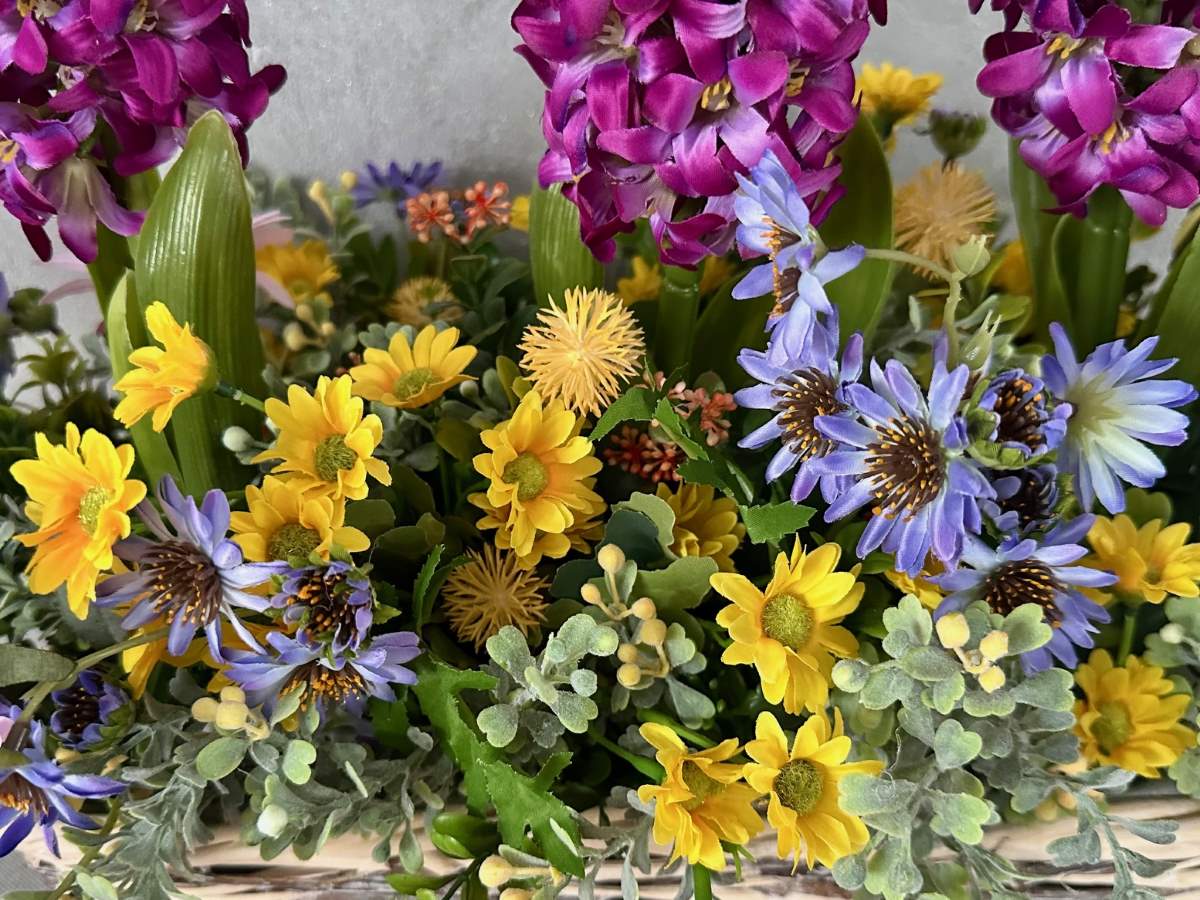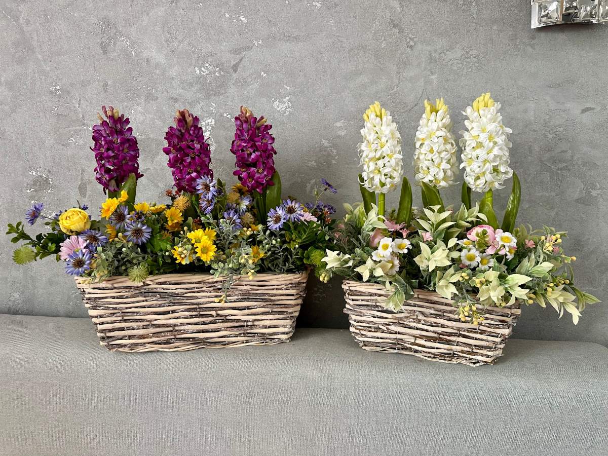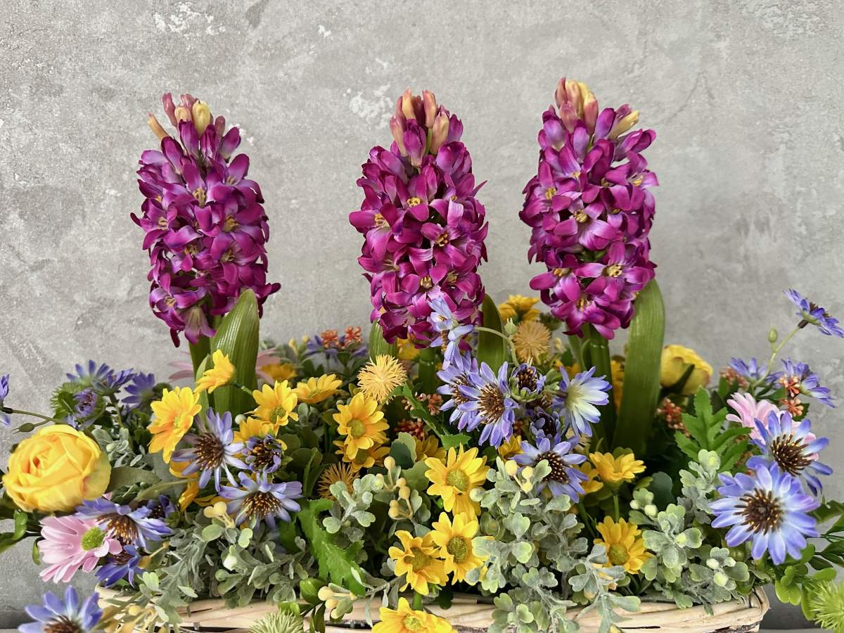 Oryginalna wiosenna dekoracja wykonana w drewnianej osłonce. Kompozycja udekorowana różnorodnymi kwiatami. Motywem dominującym dekoracji są hiacynty.