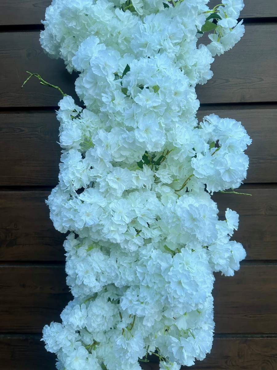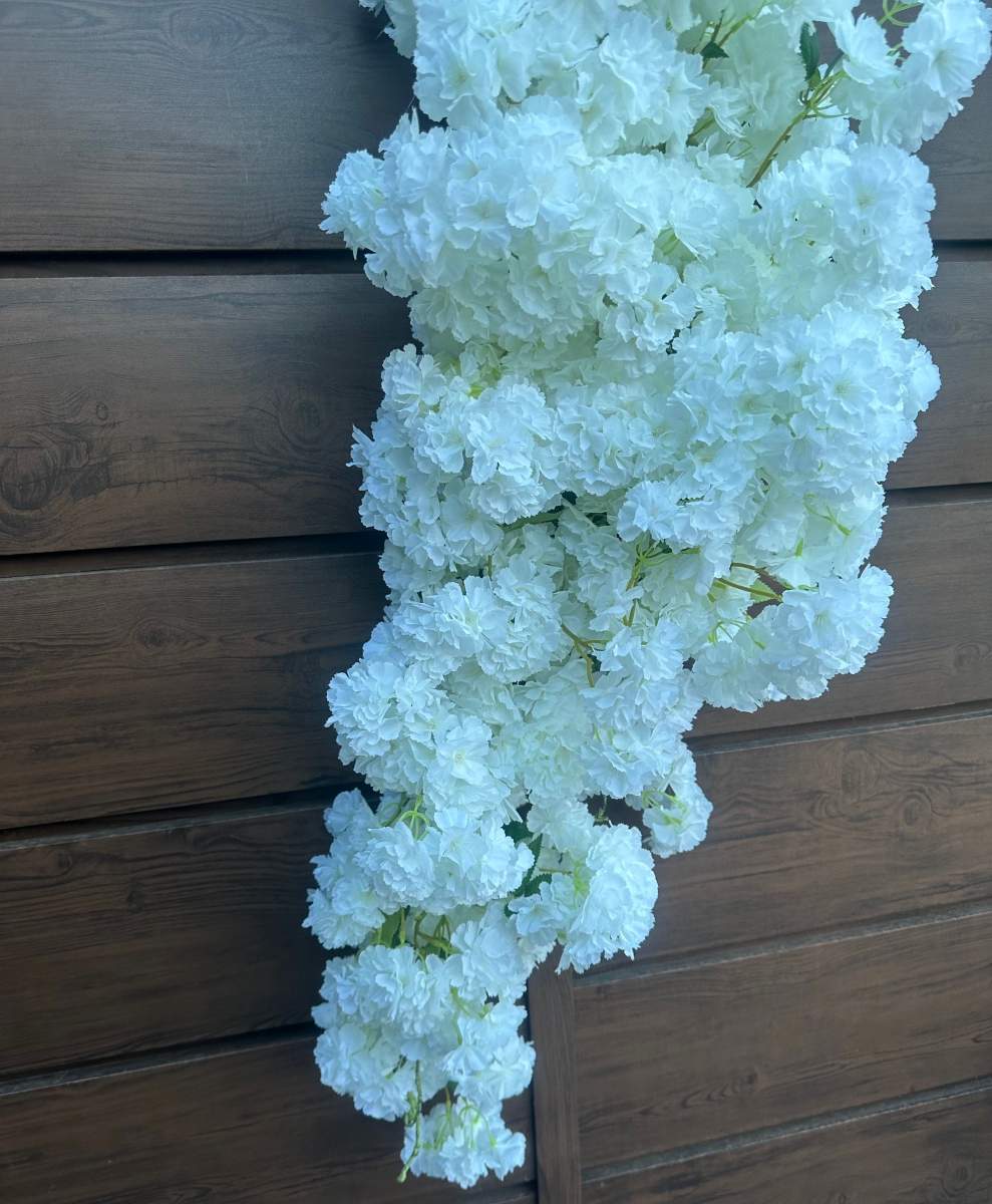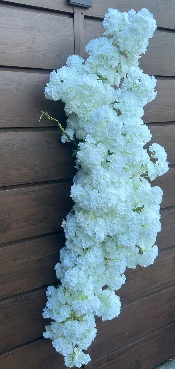 Dekoracyjna gęsta gałąź wykonana z białych kwiatów to subtelna i elegancka ozdoba . Biel kwiatów symbolizuje czystość i spokój ,dzięki czemu gałąź doskonale sprawdzi się jako element dekoracyjny podczas uroczystych okazji takich jak wesela, chrzty, czy komunie