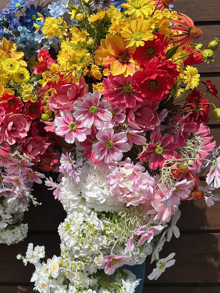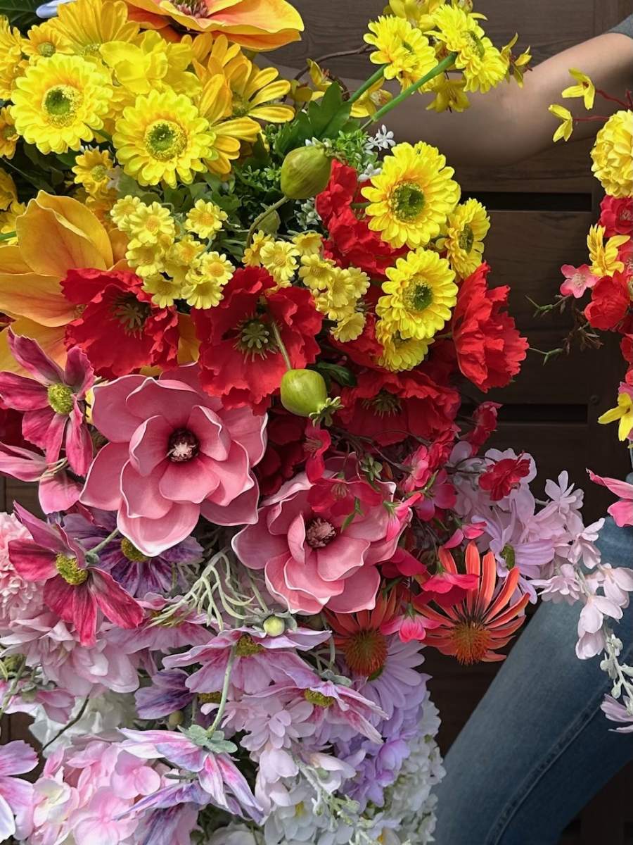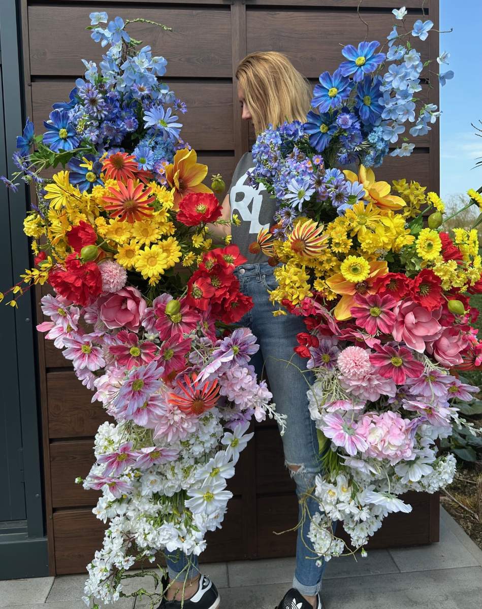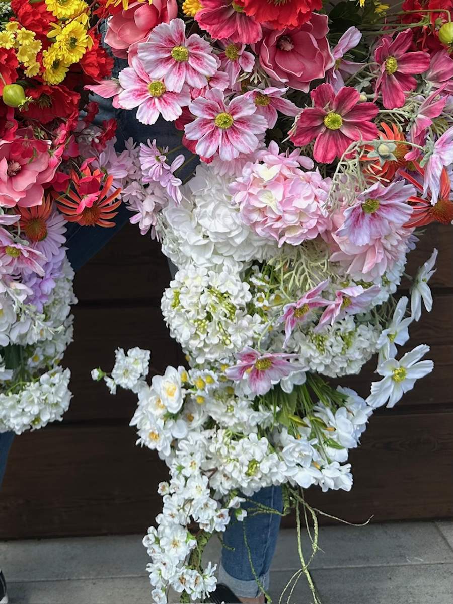 Dwie bardzo gęste , plastyczne gałęzie różnorodnych kolorowych, tęczowych kwiatów. Można je wieszać i formować według własnych potrzeb i upodobań- w pionie, poziomie. Idealne do sesji fotograficznych, do zawieszenia na huśtawce, ścianie lub jako ozdoba drzwi wejściowych.
