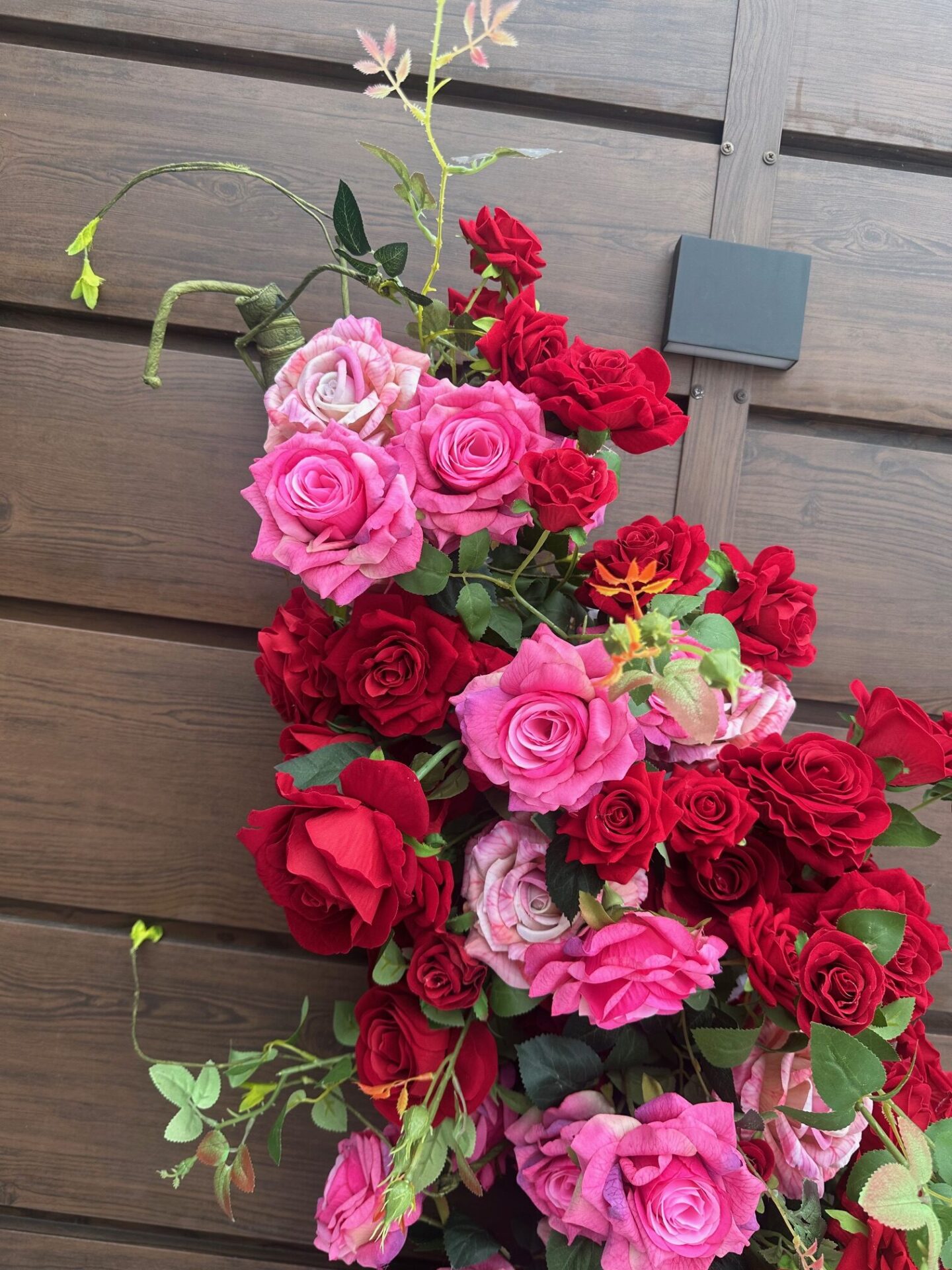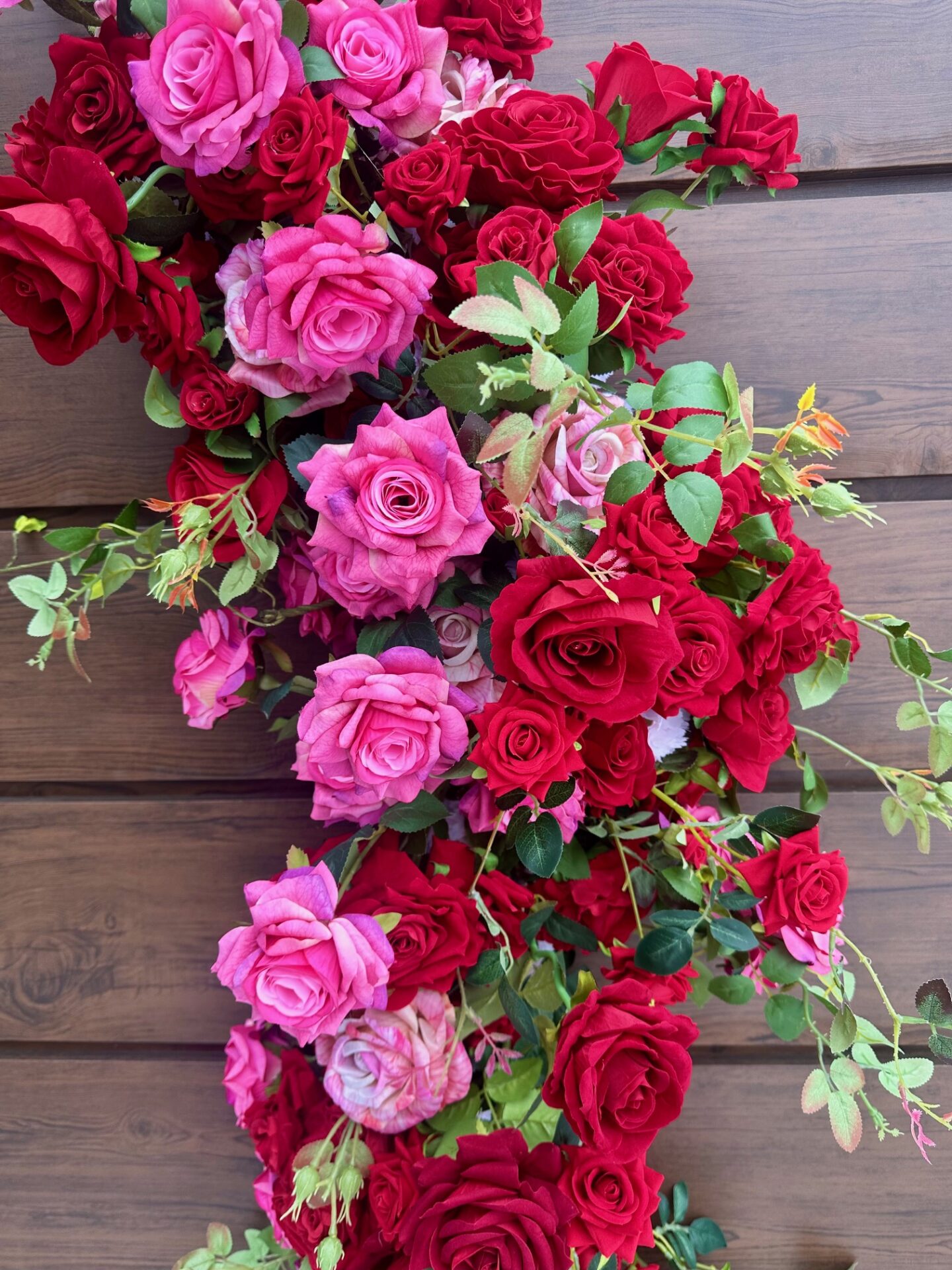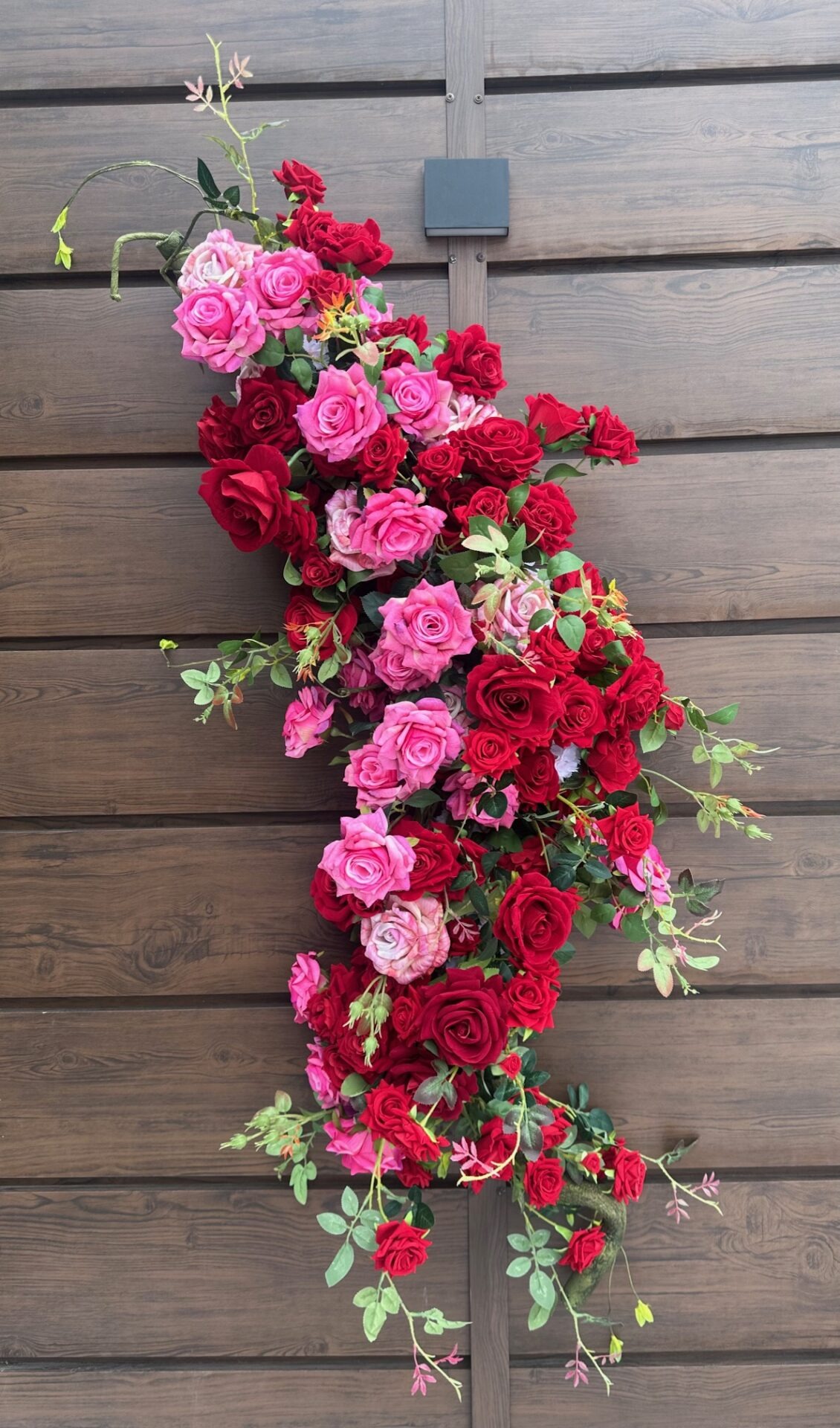 Dekoracyjna gałąź różana z kwiatami w intensywnych odcieniach czerwieni i różu. Produkt przeznaczony do aranżacji wnętrz, kompozycji florystycznych i dekoracji okolicznościowych. Gałąź można wieszać i formować według własnych potrzeb. Idealna do sesji fotograficznych, do zawieszenia na huśtawce, ścianie lub jako ozdoba drzwi wejściowych.