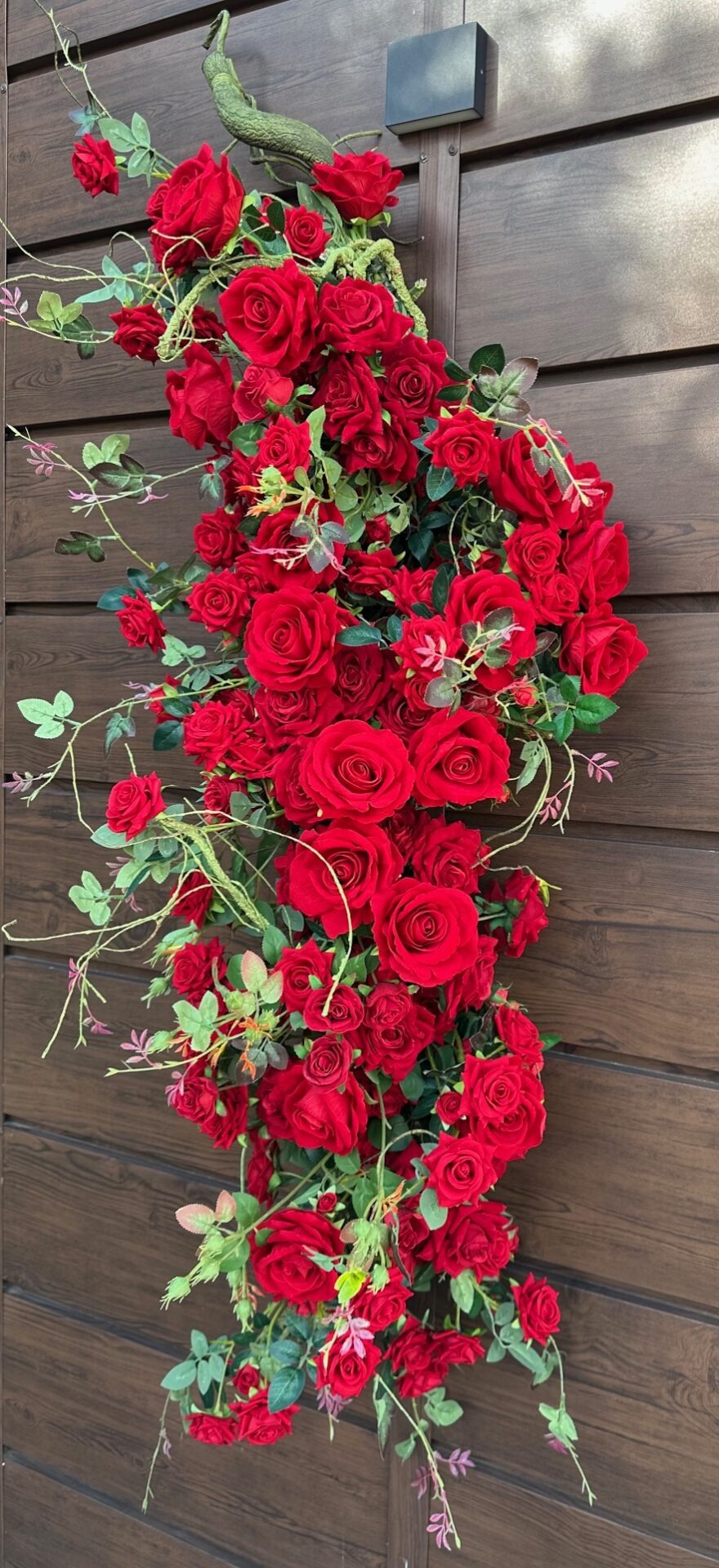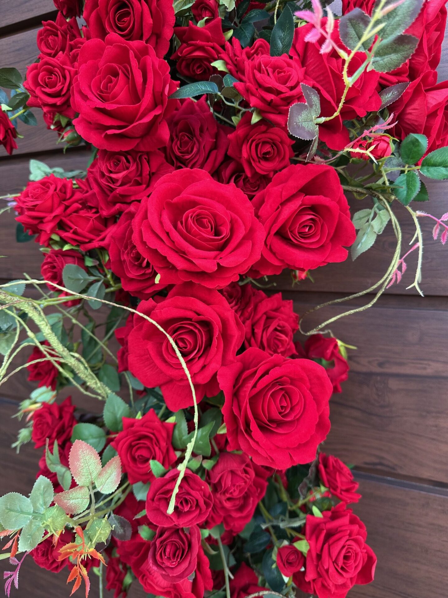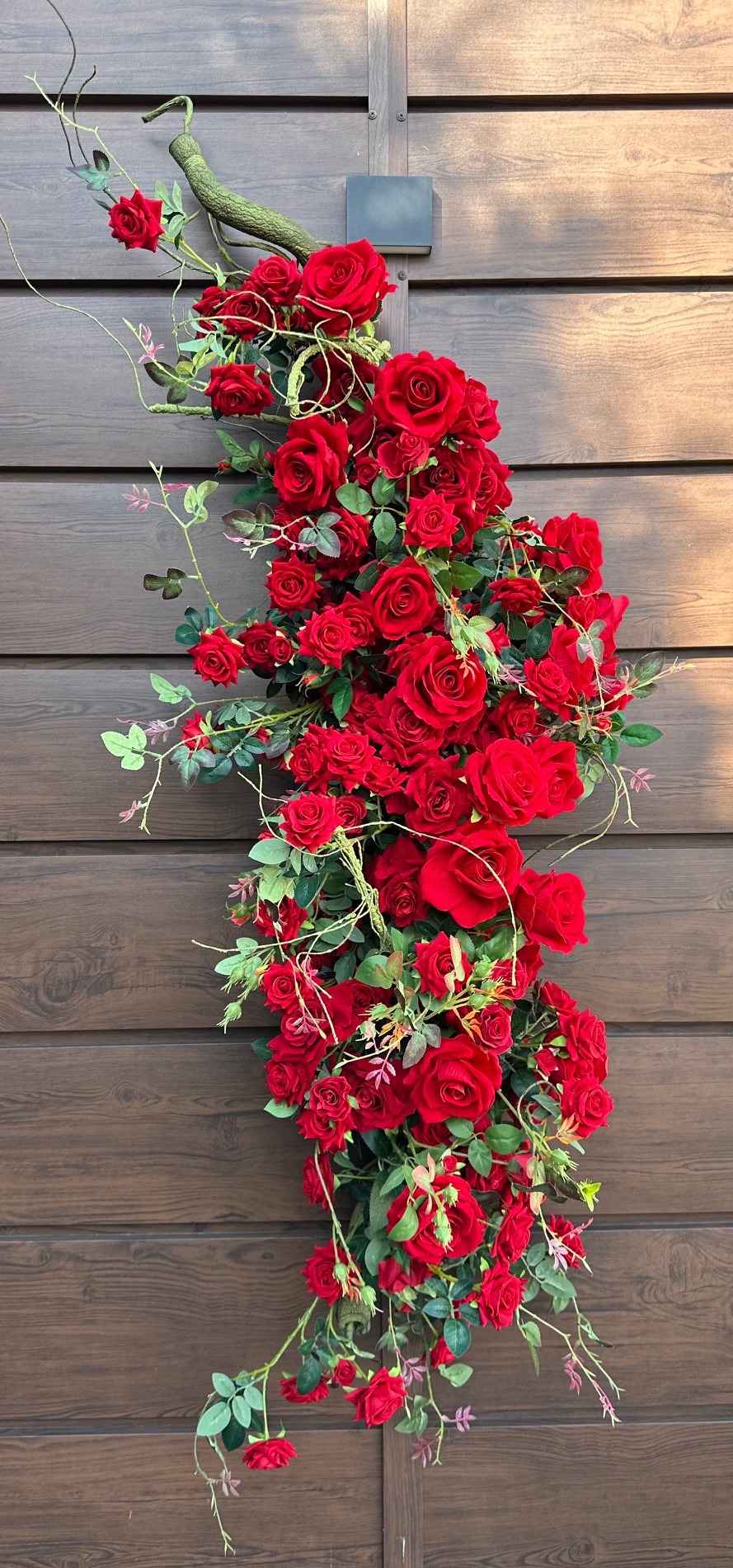 Dekoracyjna, gruba gałąź różana z kwiatami o intensywnym czerwonym kolorze. Produkt przeznaczony do aranżacji wnętrz, kompozycji florystycznych i dekoracji okolicznościowych. Gałąź można wieszać i formować według własnych potrzeb. Idealna do sesji fotograficznych, do zawieszenia na huśtawce, ścianie lub jako ozdoba drzwi wejściowych.