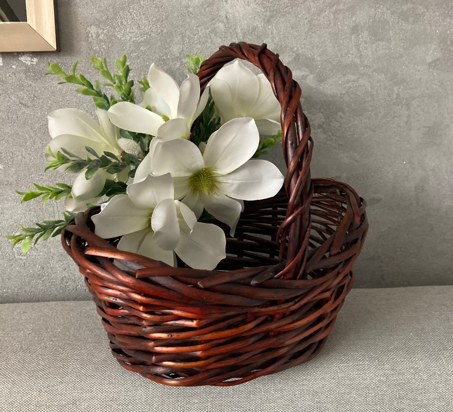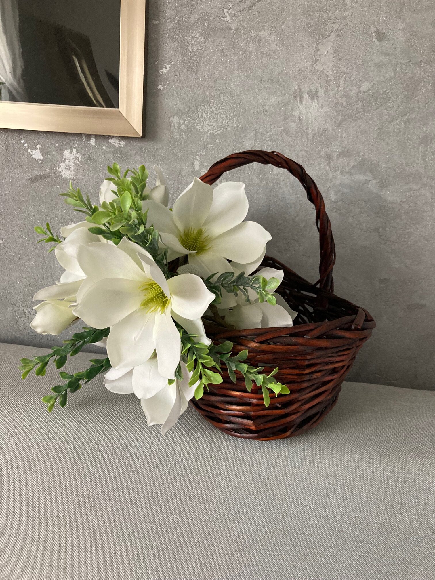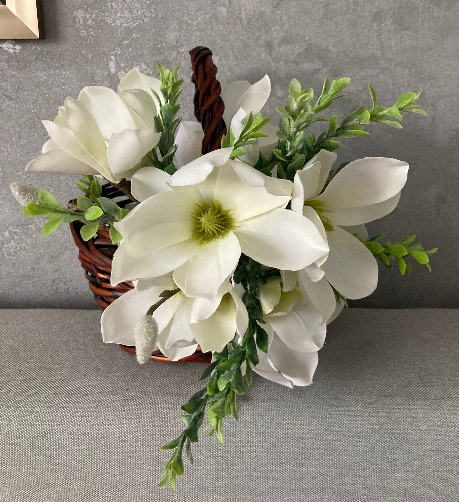 Easter basket decorated with magnolia flowers. The flowers used in the decoration are artificial.