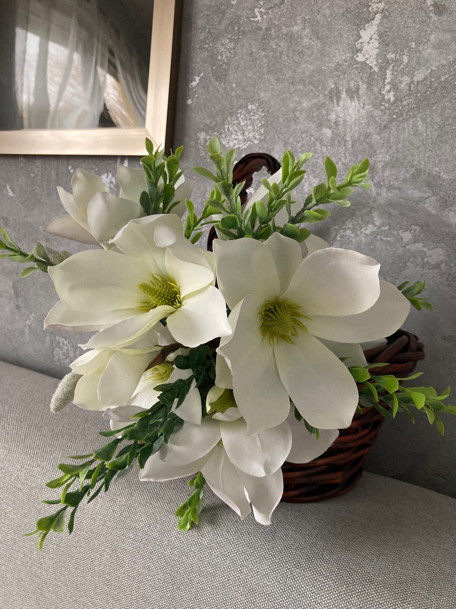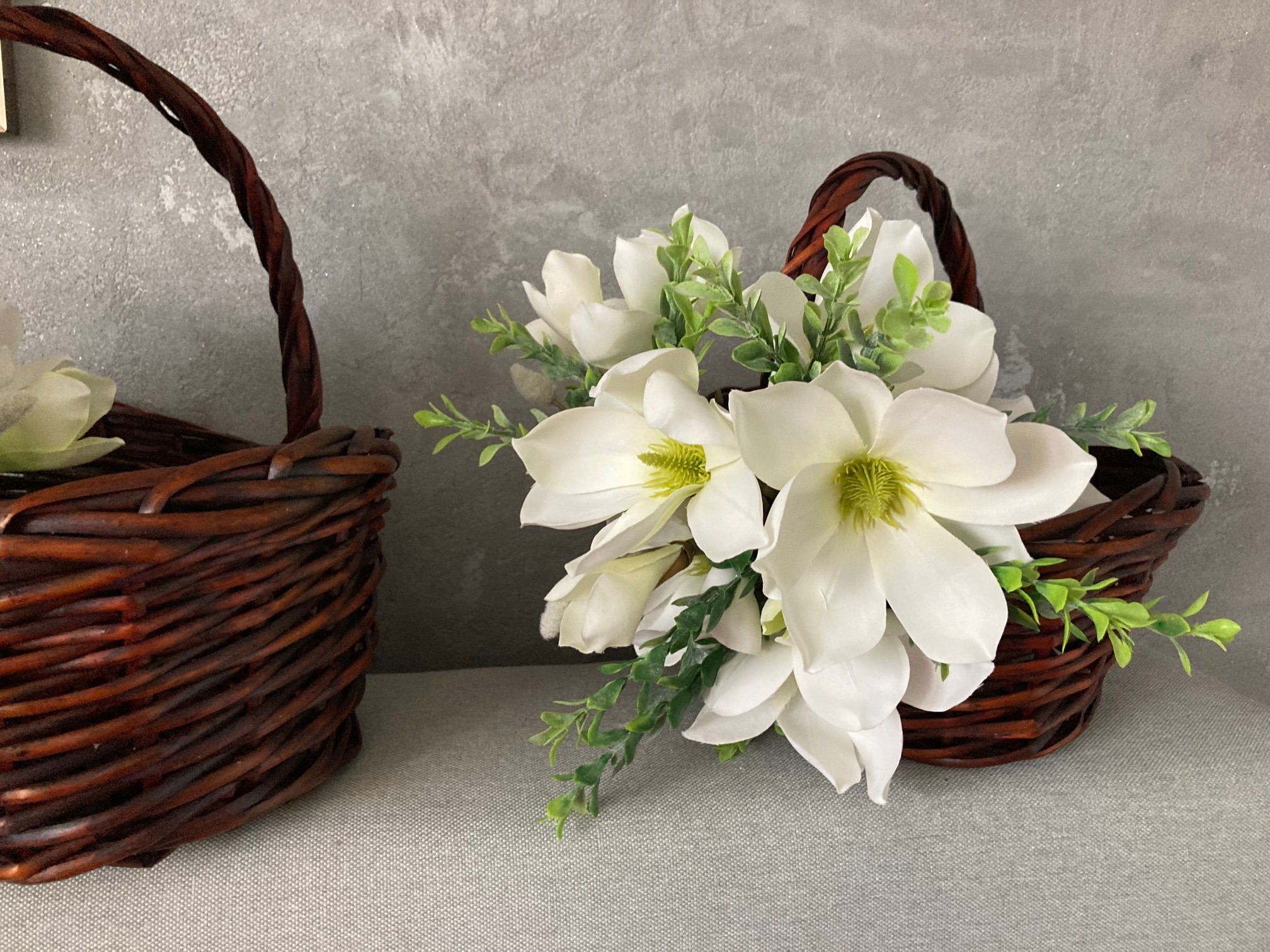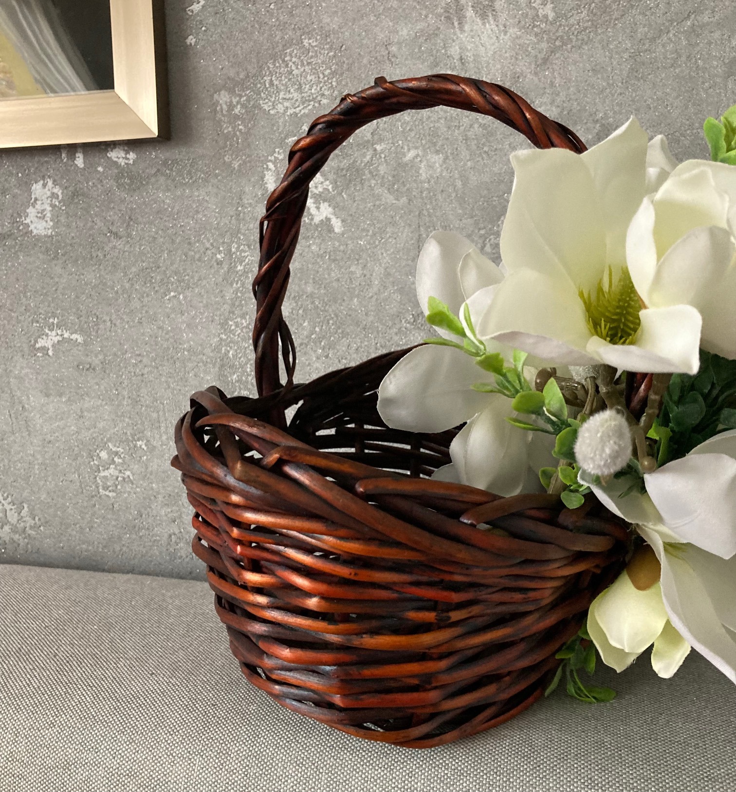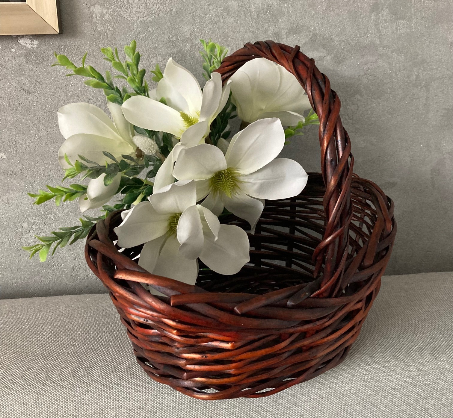 Easter basket decorated with magnolia flowers. The flowers used in the decoration are artificial.